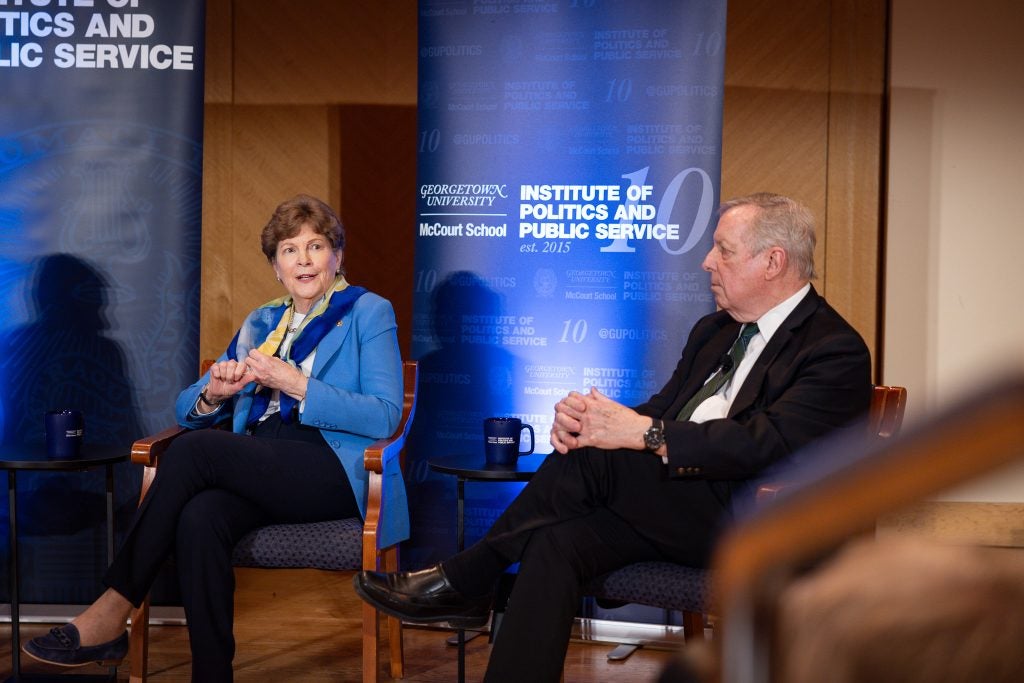 Hosted at Georgetown in Lohrfink Auditorium, former Senator Jon Tester, a Spring 2026 GU Politics Fellow, moderated a panel featuring U.S. Senators Senators Michael Bennet (D-CO), Dick Durbin (D-IL) (SFS’66, L’69), Jeanne Shaheen (D-NH) and Tina Smith (D-MN). The panel covered the intersection of economic insecurity, executive power, and accountability and what that means for the future of democracy and the Democratic Party.