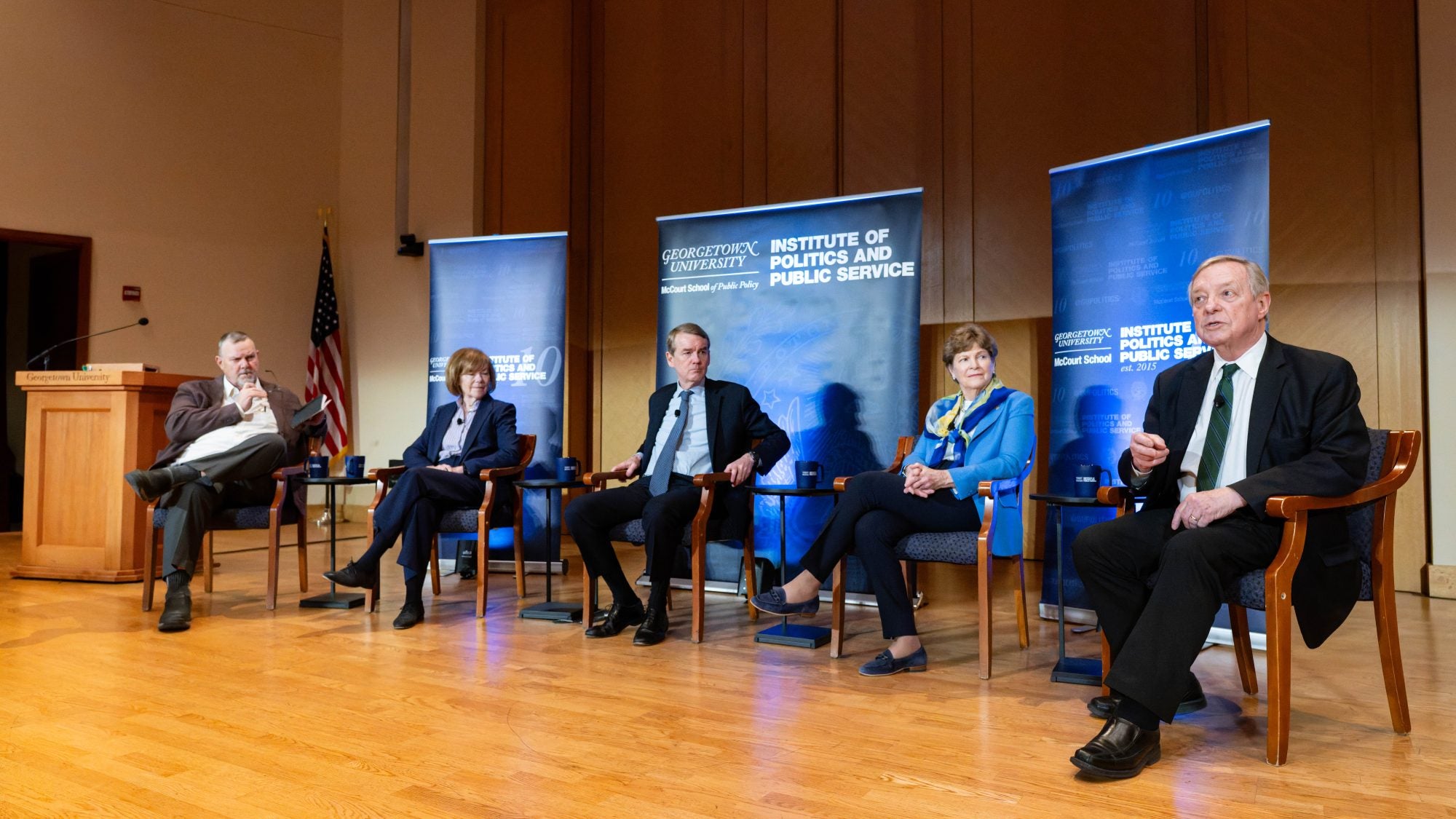 Hosted at Georgetown in Lohrfink Auditorium, former Senator Jon Tester, a Spring 2026 GU Politics Fellow, moderated a panel featuring U.S. Senators Senators Michael Bennet (D-CO), Dick Durbin (D-IL) (SFS’66, L’69), Jeanne Shaheen (D-NH) and Tina Smith (D-MN). The panel covered the intersection of economic insecurity, executive power, and accountability and what that means for the future of democracy and the Democratic Party.
